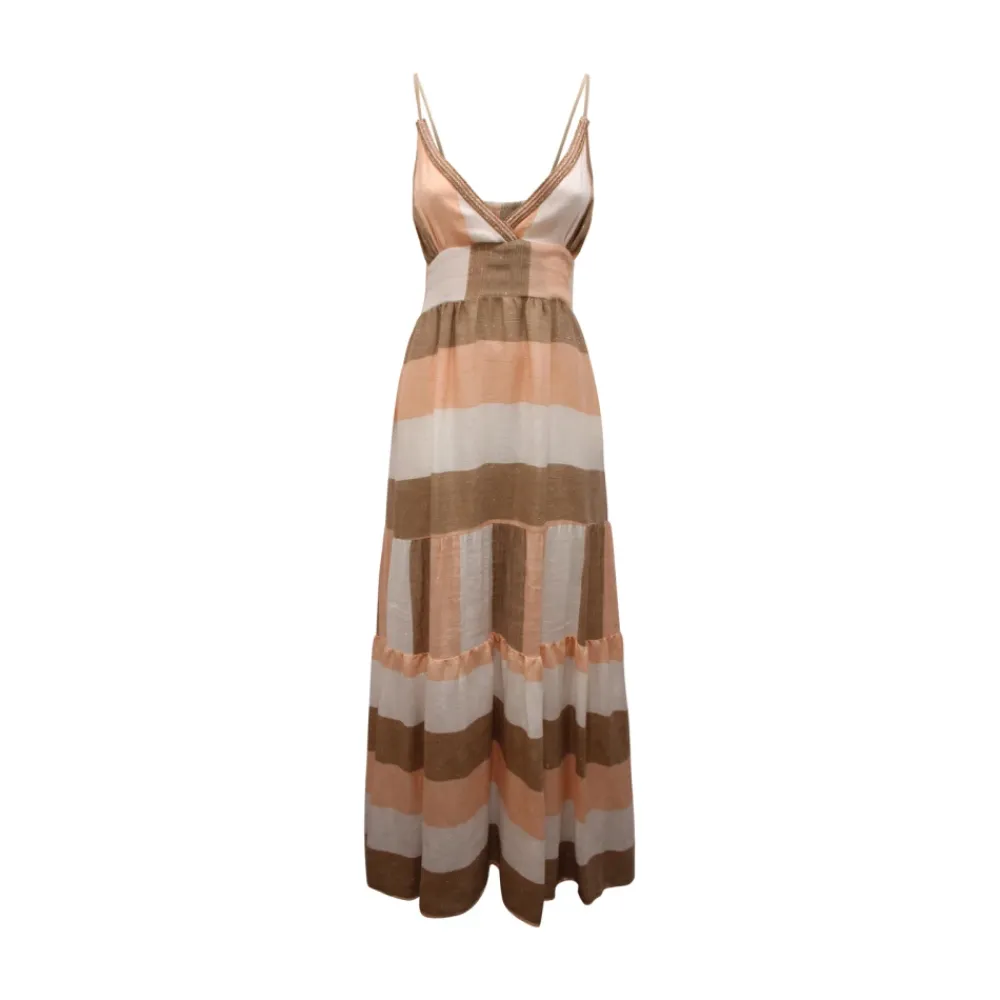 PHO Firenze N7199 Linnedkjole er en maxi-dagkjole med en stribet laksefarvet bund og subtile lurex-tråddetaljer. Den elastiske ryg og det matchende bindebånd skaber en justerbar, flatterende silhuet til hverdagsbegivenheder. Vigtigste egenskaber: Multicolor | Rosa salmone | Bianco | Beige | Linnedblanding | Elastisk ryg for fleksibel pasform | Bindebånd i taljen | Tynde skulderstropper | V-hals med påsat passementeri | Stribet mønster på laksefarvet bund | Lurex-tråddetaljer | Bredt skørt med lagdelte flæser | Dimensioner og pasform: Maxi-længde | Elastisk ryg for justerbar pasform | Bindebånd til formning af taljen