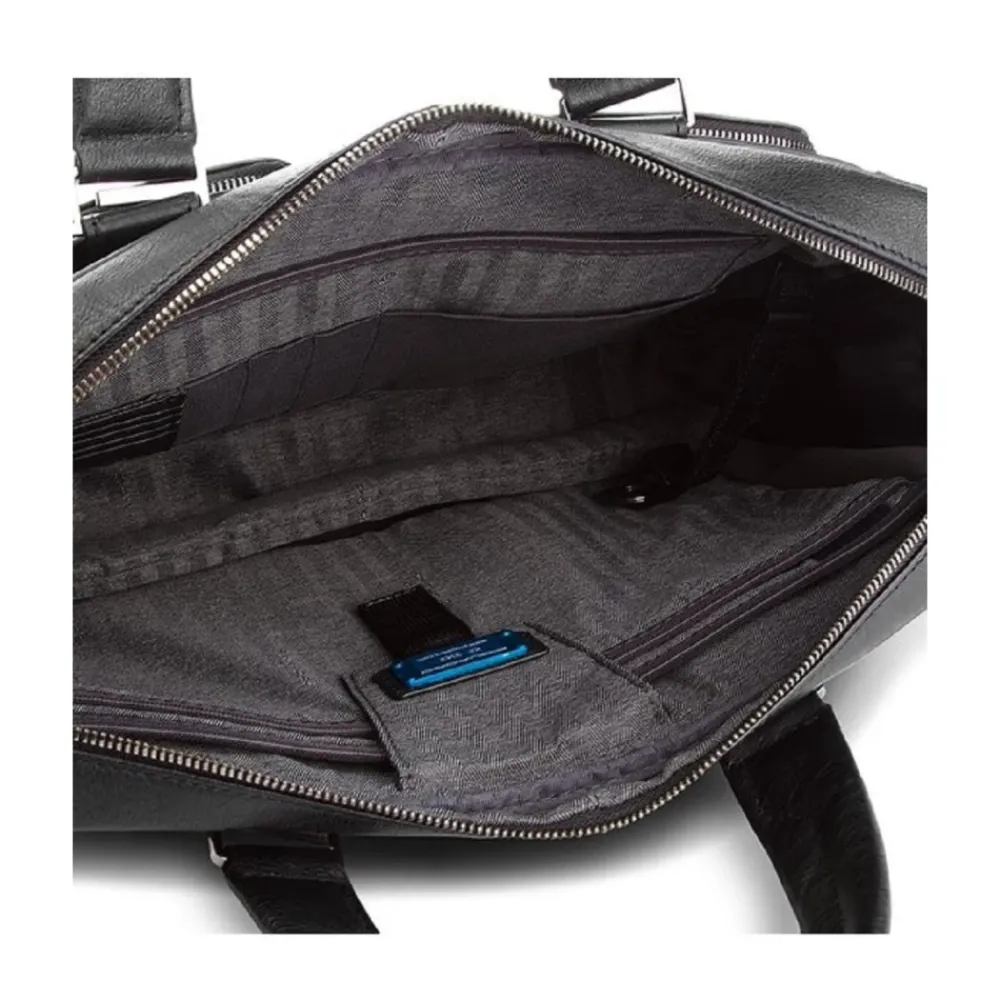 Piquadro Slim Computer Taske 15″ med iPad Rum er en kompakt lædertaske designet til organiseret, professionel transport. Den kombinerer en polstret neopren lomme til bærbar computer med dedikeret tablet opbevaring og flere interne rum til daglig pendling. Vigtigste egenskaber: Sort | Læder | Polstret rum til bærbar computer | Støddæmperbeskyttelse | Trolley fastgørelsessystem | Aftagelig skulderrem | Lynlåslukning | Fast intern organisering | Aftagelig intern nøgleholder | Ekstern foldbar flaskelomme | 4 kreditkort slots | Horisontal konstruktion | Forarbejdning med piping | To faste håndtag | Slank profil | Eksterne lynlåslommer foran | Mål & pasform: 39.00 x 29.50 x 10.00 (cm) | Passer til op til 14″ notebooks | Kompatibel med iPad 10.5″ / 9.7″ og iPad 11″ | Slank/kompakt profil | Sammensætning & pleje: Okse læder | Neopren (PC holder) | 100% Polyester (foring) | Rengør læder med et neutralt voksbaseret produkt påført med en blød klud; brug ikke opløsningsmidler, benzin eller alkohol. Må ikke nedsænkes i vand; dup tør, hvis den er våd, og undgå direkte varme. Rengør stofdele med en svamp, vand og neutral sæbe. Må ikke stryges eller renses. Brug et dedikeret læder- og stofplejesæt til vedligeholdelse.