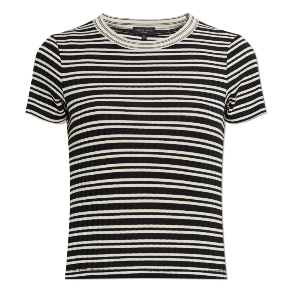 Rag & Bone Luca Contrast Striped Tee er en klassisk T-shirt med rund hals, der kombinerer en finribbet modalstrik med jævne, vandrette striber for et raffineret hverdagslook. Designet til at blive brugt lag på lag eller alene, den tilbyder en silkeblød følelse og et strejf af stretch for komfortabel brug hele dagen. Nøgleattributter: Elfenben | Sort | Flerfarvet | Modal | Silkeblød følelse | Stretch | Uforet | Rund hals med ribkant | Korte ærmer | Vandret stribemønster med lige bredde | V-stingsøm bagpå | Dimensioner og pasform: Størrelse Small: Kropslængde 50,8 cm, bryst 74,93 cm, vidde 73,66 cm, ærmelængde 15,88 cm | Klassisk pasform | Passer normalt i størrelsen | Sammensætning og pleje: 93% modal | 7% elastan | Maskinvask kold vrangen ud på skånsomt program; læg fladt til tørre. Må ikke renses. Farven kan smitte af.