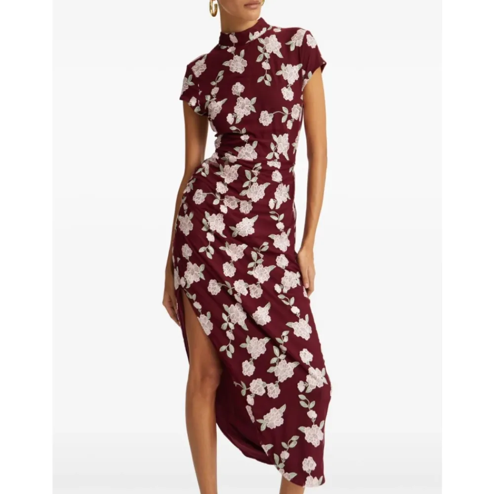 Forkæl dig selv med denne Bordeaux ROTATE Birger Christensen asymmetriske mesh kjole med smuk blomsterbroderi. Kjolen har høj hals, korte ærmer og asymmetrisk draperet nederdel med rynket talje for et tætsiddende look. Fremstillet af 100% polyester, er denne kjole perfekt til enhver kvindes garderobe.