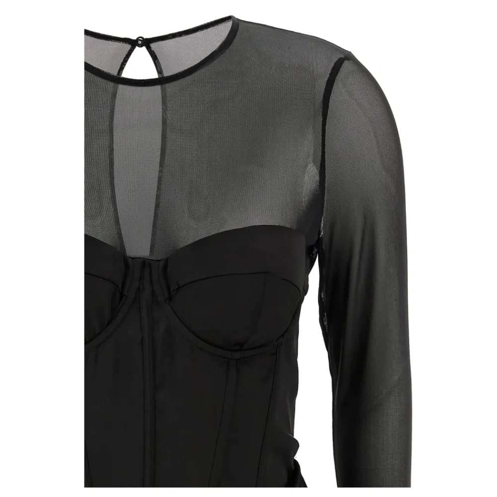 ROTATE Birger Christensen Satin Corset Mini Dress kombinerer en transparent mesh-overdel med et struktureret satin corsetskørt for en skulpturel, festklar silhuet. Designet fremhæver en dråbeformet udskæring bagpå og drapering foran og bagpå for et markant aftenlook. Vigtige egenskaber: Sort | Polyester | Formstøbte skåle | Stivere/skinner for struktur | Corsetkonstruktion delvist fastgjort til skørt | Lynlåslukning bagpå | Semi-transparent mesh-top | Rund halsudskæring med knaplukning bagpå | Bred dråbeformet udskæring bagpå | Lange ærmer | Corset-inspireret livstykke med synlige sømme | Drapering foran og bagpå | Satinskørt | Dimensioner og pasform: Tætsiddende | Normal i størrelsen – Tyske størrelser | Sammensætning og pleje: 100% Polyester | Foring: 95% Polyester, 5% Elastan
