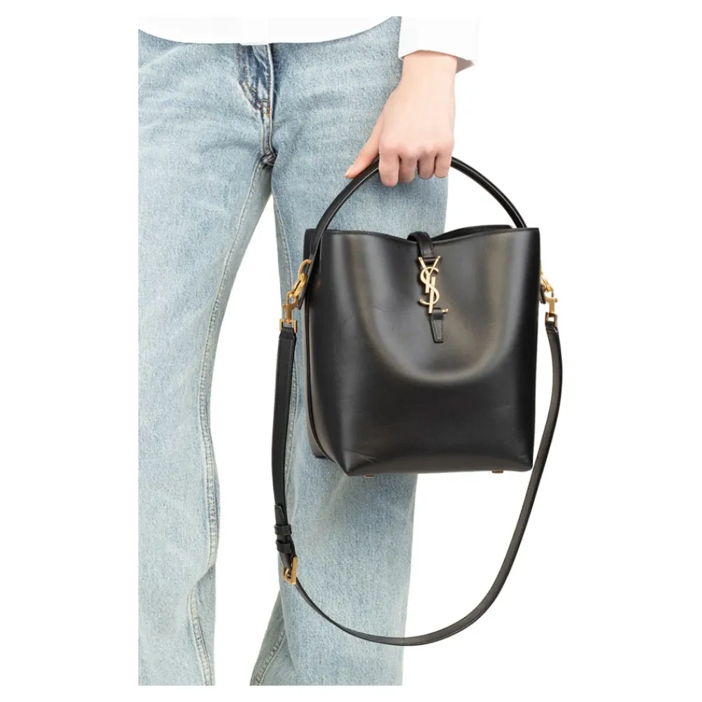 Saint Laurent Le 37 Small Leather Bucket Bag kombinerer en kompakt bucket-silhuet med brandets signatur YSL-hardware. Ideel til hverdagsbrug, den bærer sikkert dine essentielle ting, samtidig med at den tilbyder muligheder for at bære den i tophåndtaget eller crossbody. Vigtige egenskaber: Sort | Kalveskind | Et tophåndtag | Aftagelig og justerbar skulderrem | Et rum | Indvendig stiklomme | Flap-krog lukning med YSL-formet spænde | Beskyttende fødder | Bucket-silhuet | YSL-monogramspænde | Flap-krog lukning | Kompakt silhuet | Mål og pasform: 17 x 20 x 13 cm | Sammensætning og pleje: 100% kalveskind | Foring: Læder