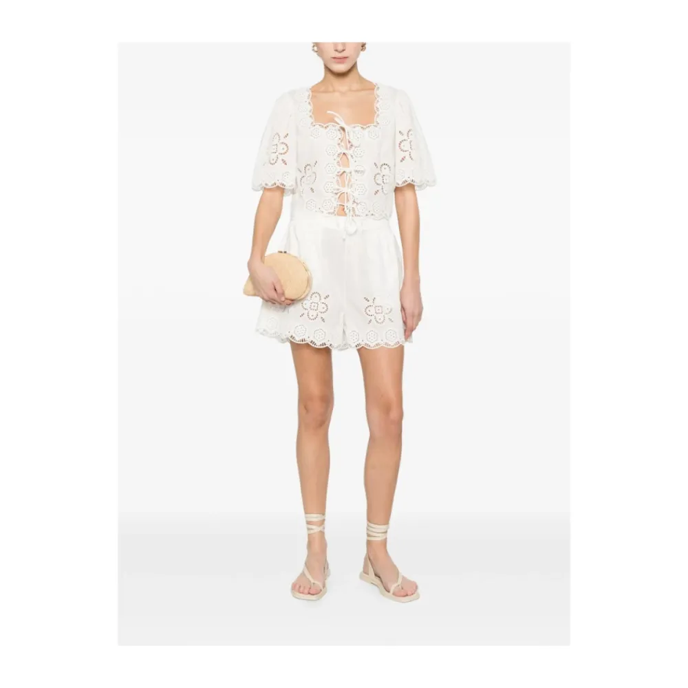 Sea NY Babette Top er en luftig blondebluse designet til et afslappet, poleret look. Den har detaljer med bindebånd foran og takkede kanter, der løfter outfits til varmt vejr. Nøgleattributter: Hvid | Bomuld | Lukning med bindebånd foran | Firkantet halsudskæring | Albuelange ærmer | Blomsterblondebroderi | Takket søm | Dimensioner og pasform: Afslappet pasform | Sammensætning og pleje: Yderstof: 100% bomuld | Broderi: 100% polyester