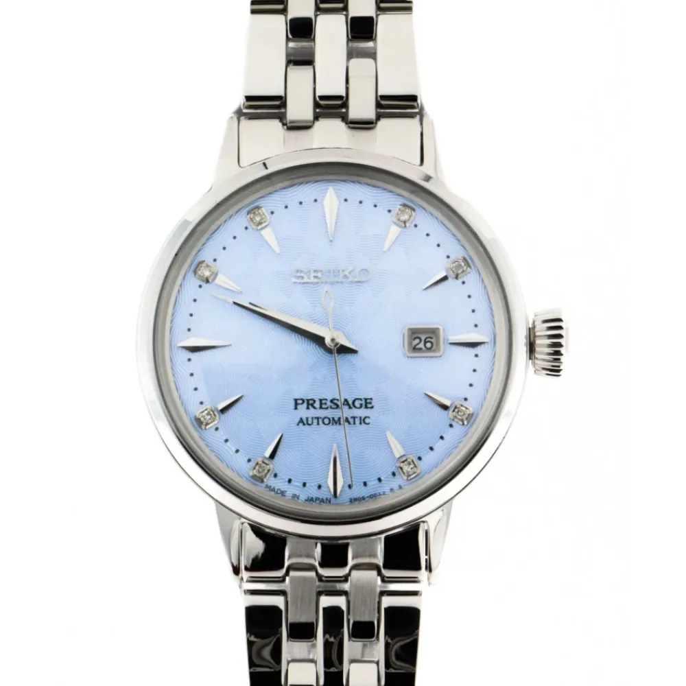 Seiko Cocktail Time Automatisk Ur kombinerer en raffineret lyseblå urskive med et rustfrit stålarmbånd og et pålideligt automatisk urværk. Det tilbyder en stil, der er klar til festlige lejligheder, med hverdagsrobusthed. Nøgleattributter: Lyseblå | Sølv | Rustfrit stål | 5 bar vandtæthed | Ca. 40-timers gangreserve | Automatisk urværk med manuelt optræk | Datovisning | Foldelås med trykknapudløsning | Skruekrone | Lyseblå solstråle-urskive med presset mønster | Diamantindeksmarkeringer | Kasseformet (buet) Hardlex-glas | Fem-rækket armbånd i rustfrit stål | Dimensioner og pasform: Kassediameter: 30,3 mm | Kassetykkelse: 10,9 mm | Lug-to-lug: 37,0 mm | Rembredde: 14 mm | Sammensætning og pleje: Rustfrit stål | Hardlex-glas | Diamant