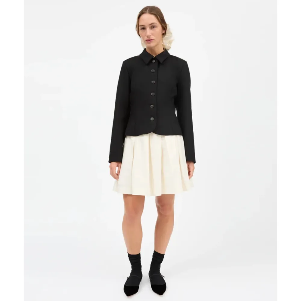 Skall Studio Ari Blazer er en enkeltknappet, skræddersyet uldblazer med en klassisk skjortekrave. Den figursyede silhuet og fronten med seks knapper gør den til et elegant valg til formelle og smarte hverdagsoutfits. Vigtigste egenskaber: Sort | Uld | Lukning med seks knapper foran | Skjortekrave | Enkeltknappet | Skræddersyede sømme | Lange ærmer | Mål og pasform: Meget figursyet; gå en størrelse op for et løsere look. | Sammensætning og pleje: 100% uld