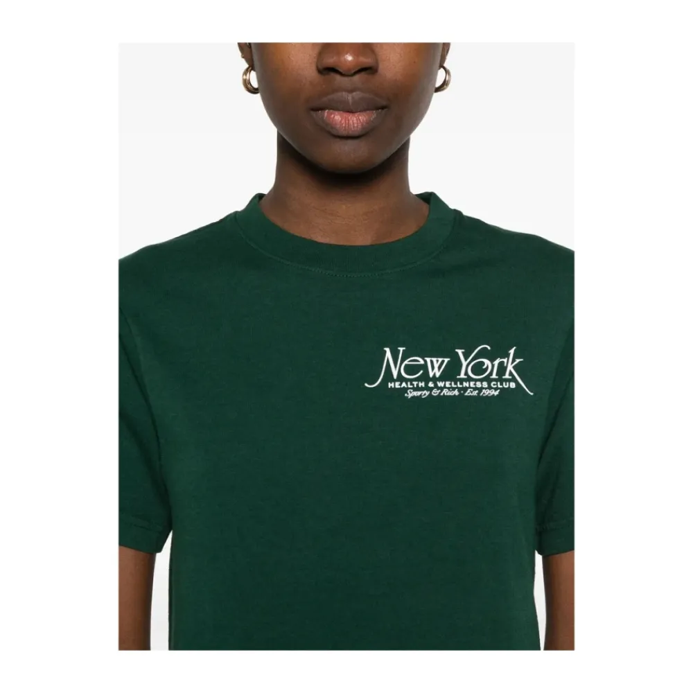Forkæl dig selv med denne skovgrønne T-shirt med logo fra Sporty & Rich. Med rund halsudskæring og korte ærmer er denne top perfekt til den modebevidste kvinde.