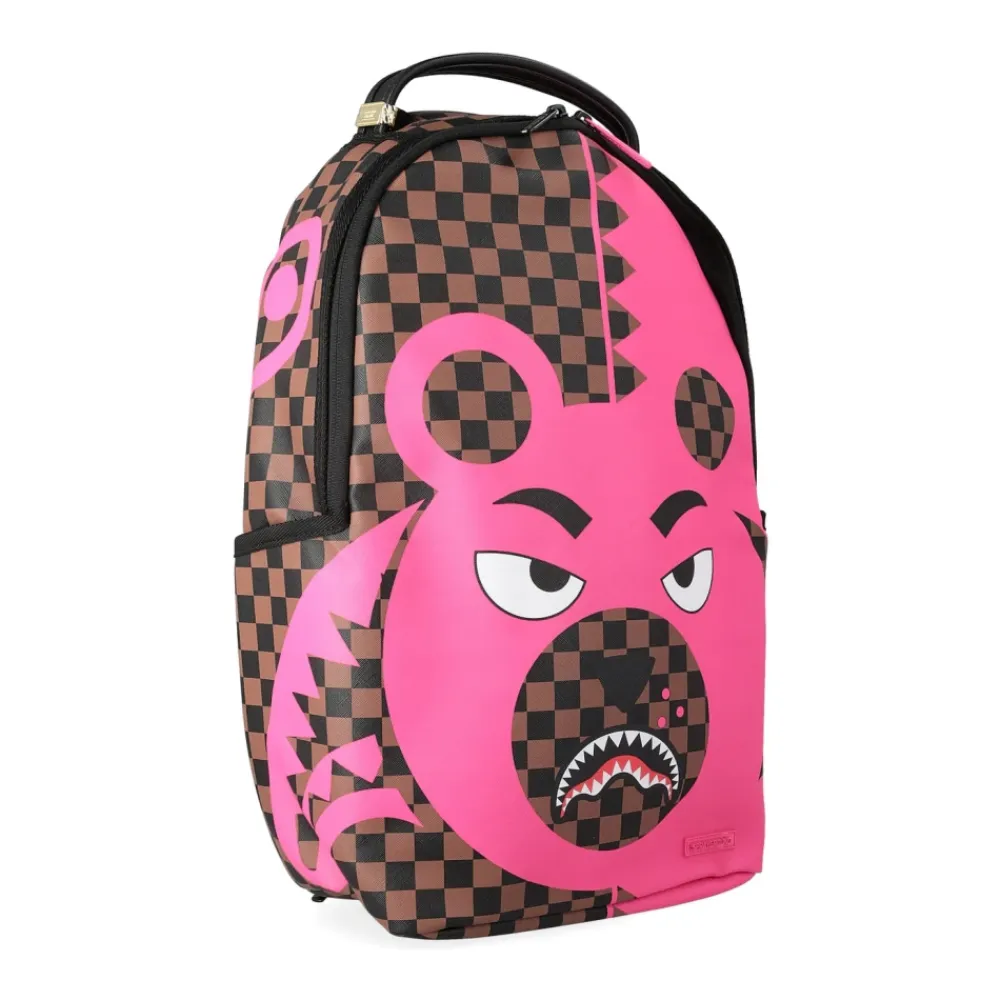 SPRAYGROUND Pink Bear Shark Rygsæk kombinerer en markant chok-pink bjørn-haj grafik med en brun base for en iøjnefaldende hverdagsrygsæk. Den er bygget til organiseret rejse og daglig brug med dedikerede rum til bærbar computer og solbriller samt en ergonomisk polstret mesh-ryg. Nøgleattributter: Pink | Rosa | Vegansk læder | Ergonomisk mesh-rygpolstring | Vandafvisende ydre | Lynlåslomme foran | Lynlåslomme til opbevaring | Sidelommer | Separat velour solbrillerum | Separat velour laptoprum | Skjult stash-lomme | Gennemgående bagagerem | Justerbare skulderstropper | Top bærehåndtag | Chokerende pink grafisk bjørn-haj motiv | Brun base/ternet baggrund | Gummi Sprayground Authentic patch | Dimensioner og pasform: 46 x 29 x 15 cm | Sammensætning og pleje: Ydre: 100% PVC | Indre: 100% polyester | Pletrenses kun.