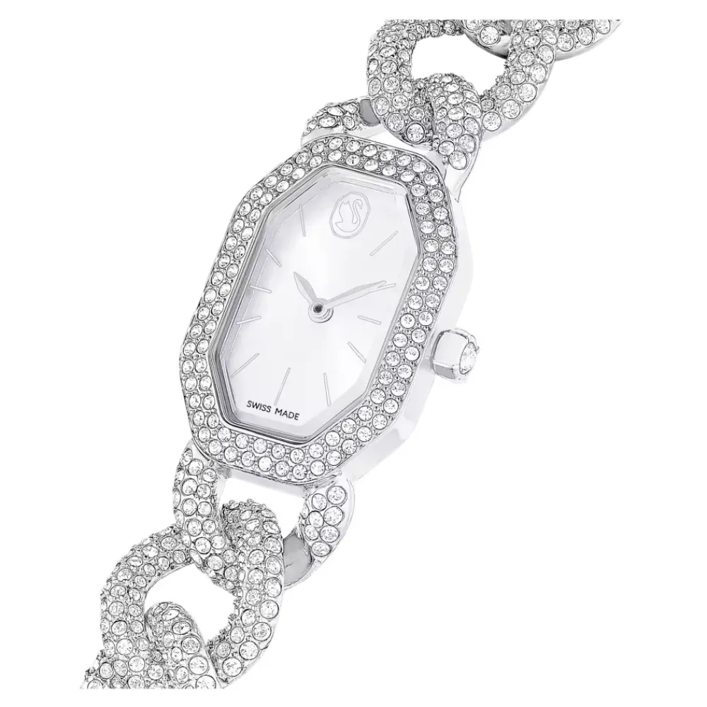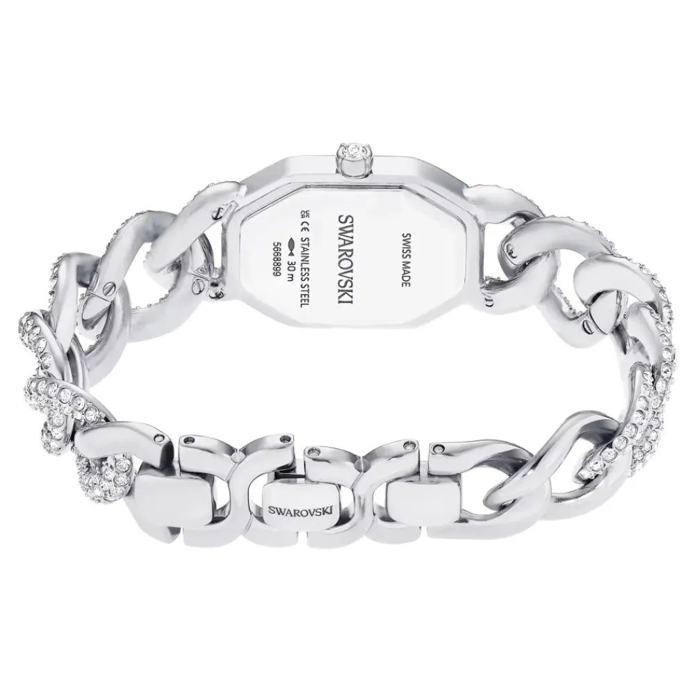 Swarovski Dextera Chain Watch kombinerer et ottekantet, krystalbesat urkasse med en justerbar gourmettekæde for et smykkelignende armbåndsur. Den mest iøjnefaldende detalje er den omfattende krystalpavé, der giver uret en raffineret, bærbar glans. Vigtige egenskaber: Sølvfarvet | Rustfrit stål | Vandafvisende ned til 30 meter | Schweizisk fremstillet | Justerbar gourmettekæde | Foldelukning | Quartz mekanisme | Ottekantet urkasse | Pavé-besat kant | Sunray-urskive med svane logo ved klokken 12 | Enkelt krystal i kronen | Justerbar gourmettekæde udsmykket med krystaller | Dimensioner og pasform: Urkassestørrelse: 44 x 20 mm | Urkassetykkelse: 7 mm | Armbåndets brugbare længde (minimum – maksimum): 15,1 cm – 16,8 cm | Armbåndets bredde: 1,4 cm | Justerbar gourmettekæde | Brugbar længde: 15,1 cm – 16,8 cm | Sammensætning og pleje: Rustfrit stål | Swarovski-krystaller