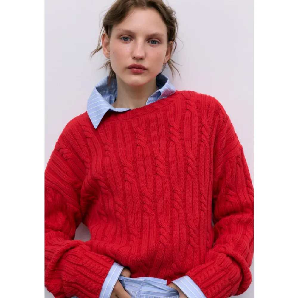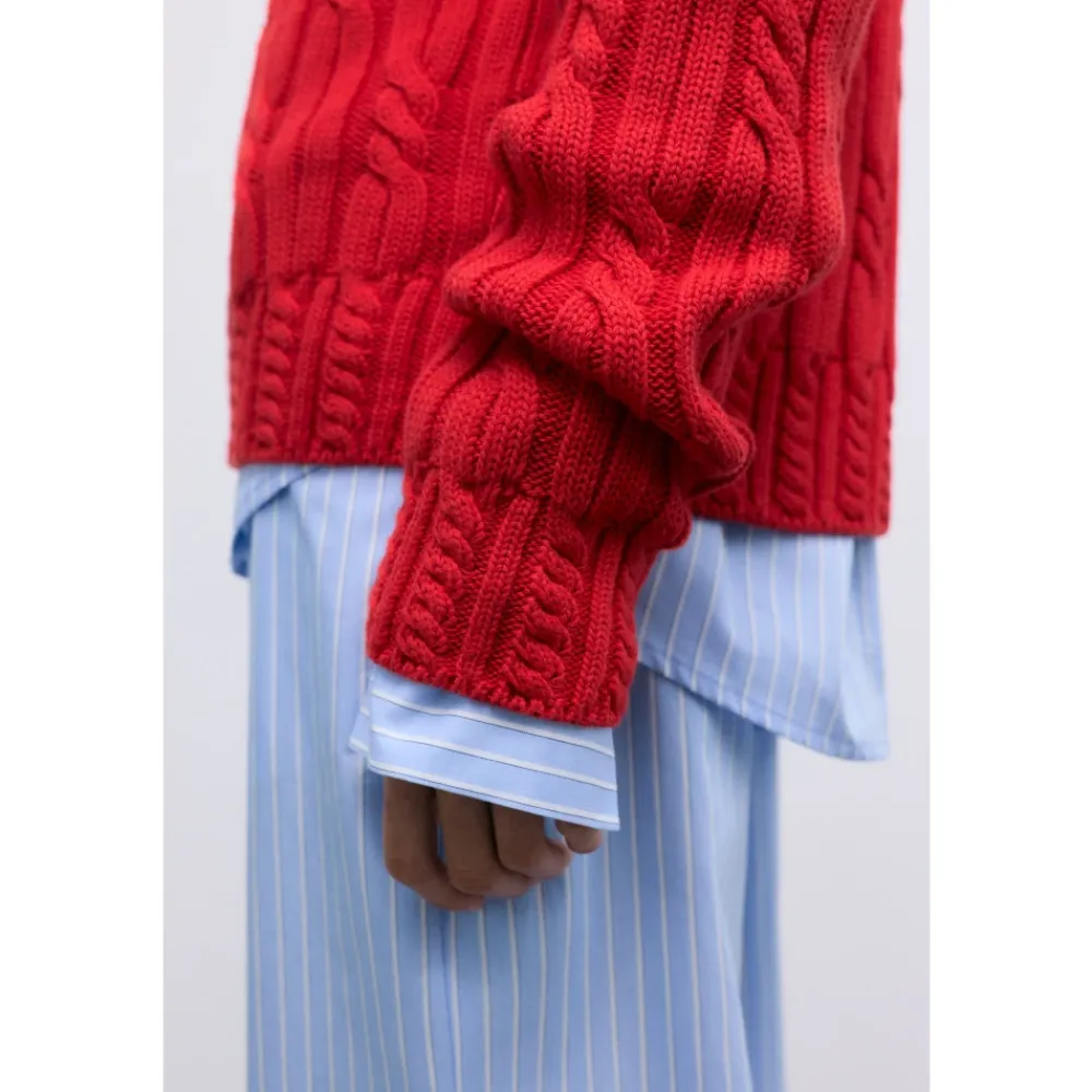 The New Society Bluebell Jumper er en kabelstrikket sweater med rund hals, fremstillet af blød bomuld, med delikate kabeldetaljer på kraven, manchetterne og kanten for et rent, hverdagslook. Nøgleattributter: Tulip Red | Bomuld | Blødt stof | Rund halsudskæring | Kabelstrikkede detaljer på krave, manchetter og kant | Ren finish | Sammensætning & pleje: 100% Bomuld