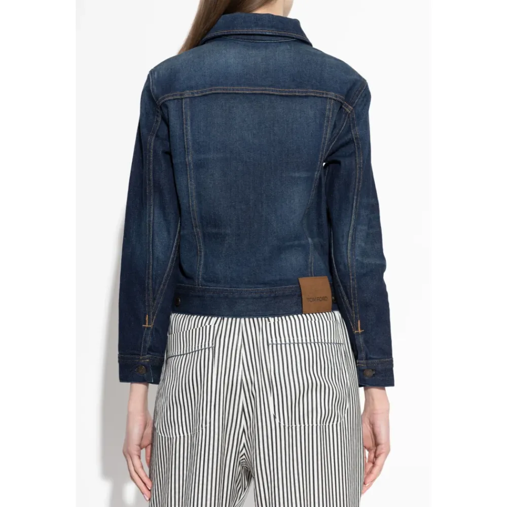 Tom Ford Denimjakke fortolker den klassiske trucker-silhuet med et skræddersyet, taljekort snit og signatur-brandede hardware. Stykket kombinerer en struktureret denimkonstruktion med subtile detaljer for et raffineret, minimalistisk garderobeelement. Vigtige egenskaber: Navy blå | Denim | Struktureret konstruktion | Holdbart stof | Påsyede brystlommer med klap | Sidelommer | Knaplukning foran | Knapmanchetter | Trucker-inspireret silhuet | Taljekort snit | Kontrastsyninger | Brandede metalknapper | Mål og pasform: Modelhøjde: 177 cm | Buste: 83 cm | Talje: 61 cm | Hofter: 89 cm | Skræddersyet pasform | Taljekort snit | Modellen er iført størrelse S | Sammensætning og pleje: 98% bomuld | 2% polyurethan