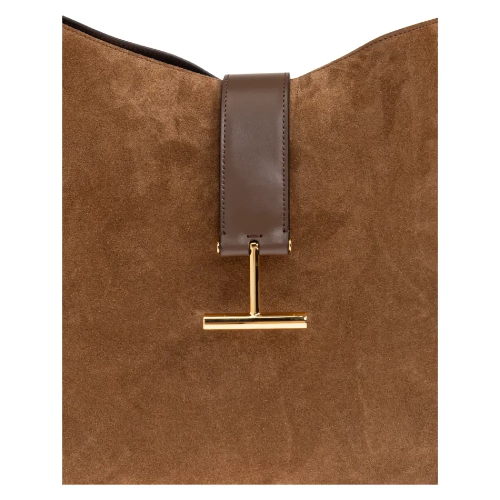 Tom Ford Tara Large Crossbody kombinerer en klassisk hobo-silhuet med en iøjnefaldende guldfarvet T-formet lukning, designet til alsidig brug over skulderen eller som crossbody og til en elegant hverdagsstil. Vigtigste egenskaber: Brun | Ruskind og kalveskind | Holdbar konstruktion | Komfortabel til daglig brug | Bred skulderrem | Aftagelig og justerbar crossbody-rem | Magnetisk T-formet lukning | Midterrum med lynlås, der deler interiøret | Hobo-silhuet | Afrundede linjer | Kontrasterende glat læderkant | Guldfarvet T-formet detalje | Mål & pasform: Højde: 38 cm | Bredde: 40 cm | Kan bæres over skulderen og som crossbody | Rummeligt interiør, der er egnet til daglig brug | Sammensætning & pleje: Ruskind | Glat læder (kalveskind) | Polyamidforing | Polyurethanforing
