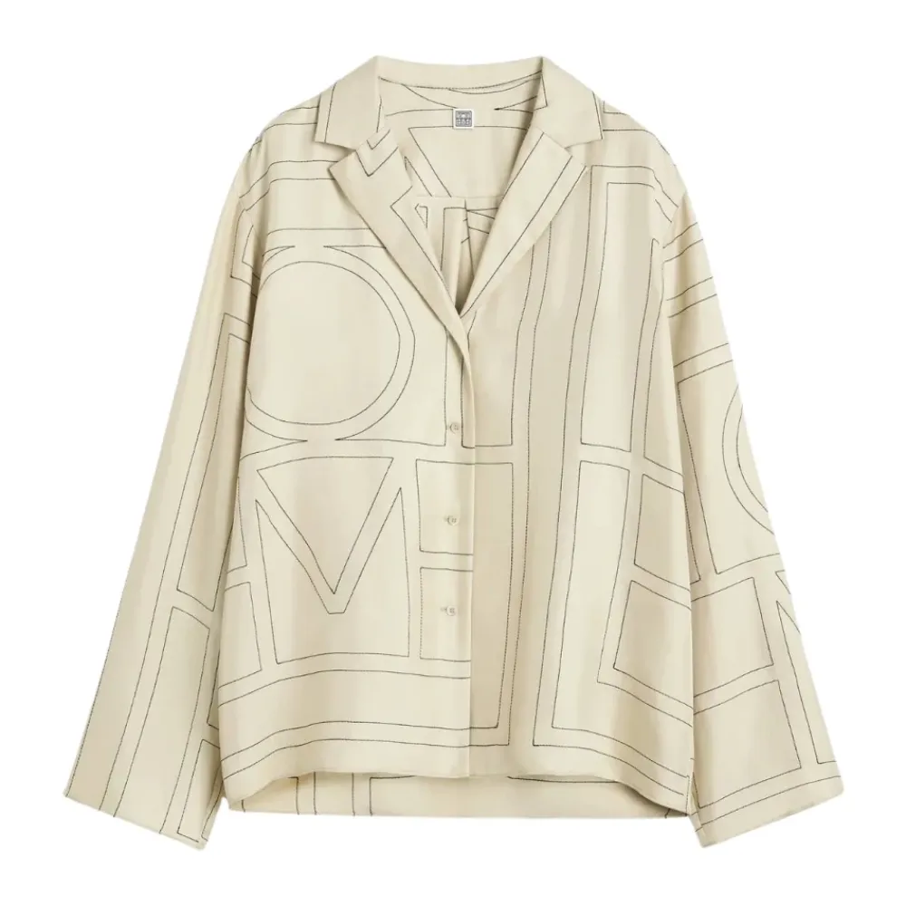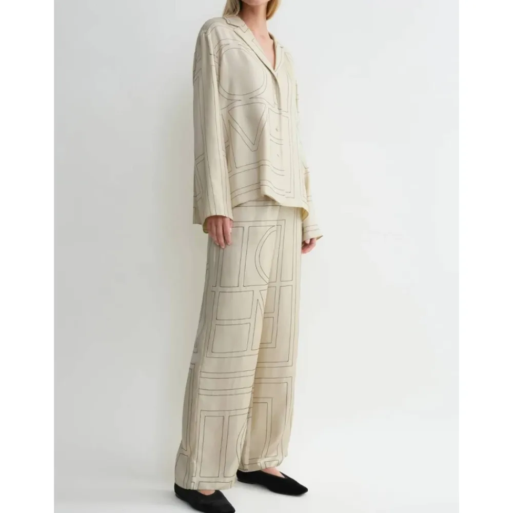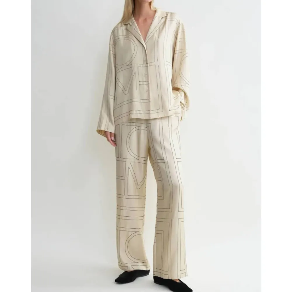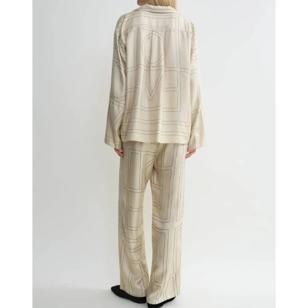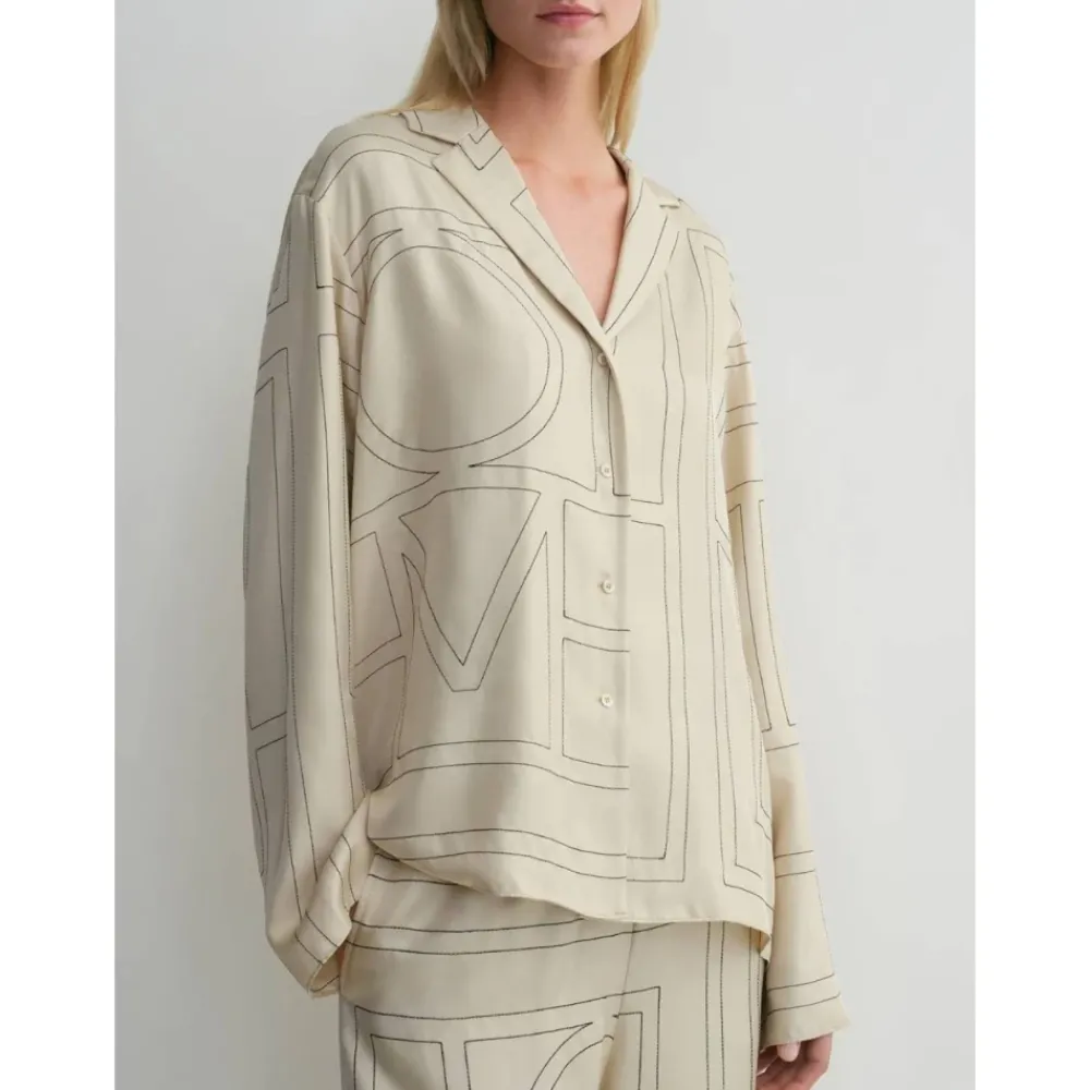 TotêMe Monogram Silk PJ Top er en silke pyjamabluse fra TotêMe, med en broderet monogramdetalje og en hakket krave, der gør den velegnet til både dag og aften. Nøgleattributter: Beige | Beež | Silke | Knaplukning | Hakket krave | Lange ærmer | Broderet monogrammønster | Pyjamainspireret silhuet | Mål og pasform: Afslappet snit | Følger EU-størrelser | Sammensætning og pleje: Silke