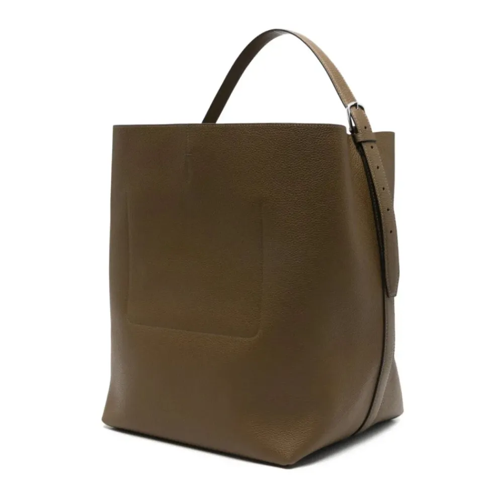 Totême Bæltet Tote i Kornet Læder er en alsidig hverdags taske, der kombinerer en bæltet, justerbar skulderrem med en åben top og karabinhagelukning for nem adgang og sikker transport. Nøgleattributter: Brun | Mørk taupe | Kornet læder | Resin-belagt interiør | Justerbar skulderrem med metalspænde | Karabinhagelukning (snor) | Indvendige slip lommer | Åben top | Logo-graveret hardware | Bæltet rem detalje | Kontrastsyninger | Minimalt logo stempel | Generøs bucket silhuet | Kornet tekstur | Dimensioner & pasform: Bredde: 34 cm | Højde: 37 cm | Dybde: 27 cm | Remfald: 29 cm (justerbar) | One size | Justerbar rem (29 cm fald) | Sammensætning & pleje: Ko læder