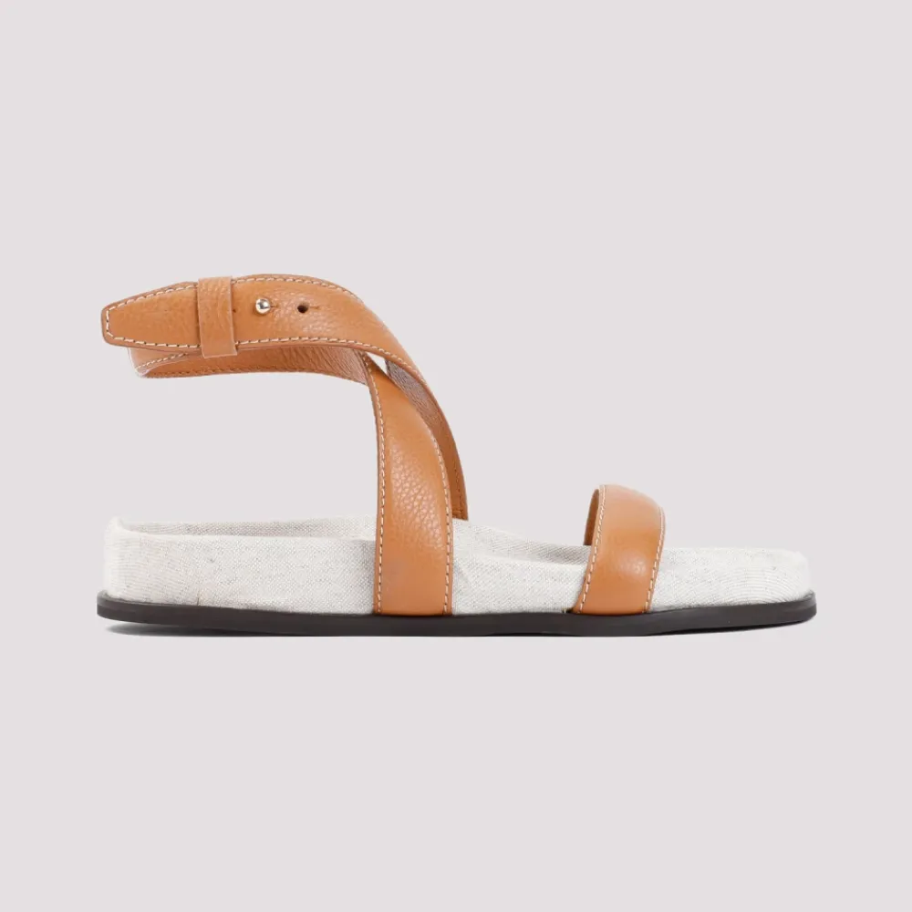 Forhøj din stil med disse elegante Totême lædersandaler. Fremstillet af ren tan brunt læder, har disse kraftige sandaler en rund og åben tå, tonal læderrem og en justerbar ankelrem for en tilpasset pasform. Den hvide og sorte sål tilføjer et moderne touch. Perfekt til enhver lejlighed, disse sandaler er et must-have for enhver modebevidst kvinde. Træd ud i stil med Totême…