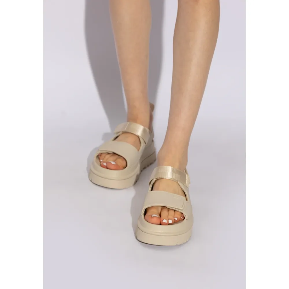 UGG Goldenglow Platform Sandaler leverer en let, polstret platformsandal, der er bygget til hverdagsbrug med justerbare velcrostropper for en sikker pasform. Model: Goldenglow – designer ID 1152685. Vigtige egenskaber: Beige | Creme | Gummi | Letvægts EVA-skumsål | Skridsikker ydersål | Justerbare velcrolukninger | Trækstrop bagpå for nem på- og aftagning | Føleligt logo | Platform med rillet slidbane | Dimensioner og pasform: Sålhøjde: 4,5 cm | Sålhøjde på højeste punkt: 5,5 cm | Sammensætning og pleje: TPU-overdel | EVA-mellemsål og ydersål | Tekstilforing