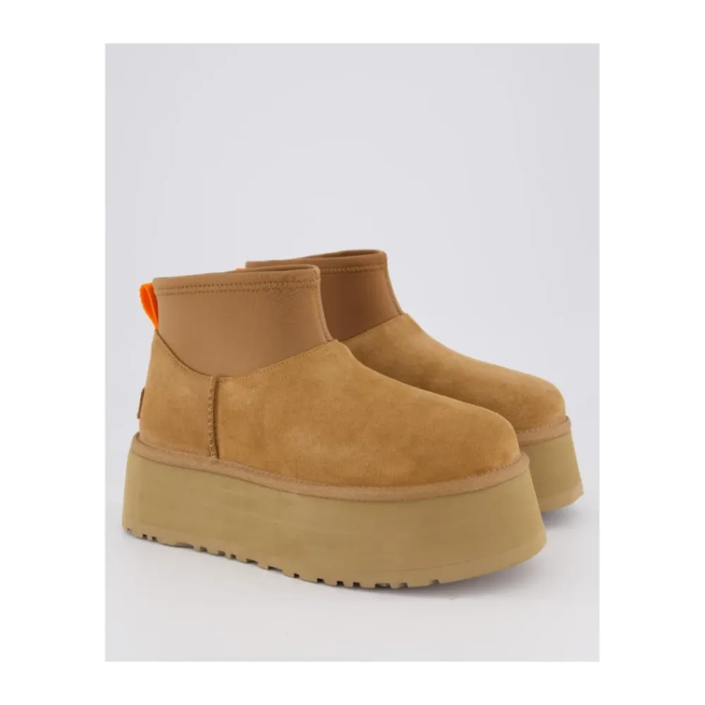 Hold dig stilfuld og hyggelig denne vinter med disse brune UGG Classic Mini Dipper ankelstøvler til kvinder. Fremstillet med en ruskindsoverdel, neopren skaft og UGGplush foring, har disse støvler en platformssål med en højde på 5 cm for ekstra komfort. Komplet med en hæl trækfane af polyester, skumindlægssål og EVA-mellemsål, er disse støvler perfekte til koldt vejr. Den sukkerroer EVA-ydersål giver trækkraft, mens det prægede logo på hælen tilføjer et strejf af elegance..Denne model er en smule stor i størrelsen – ligger du mellem to, anbefaler vi den mindste.