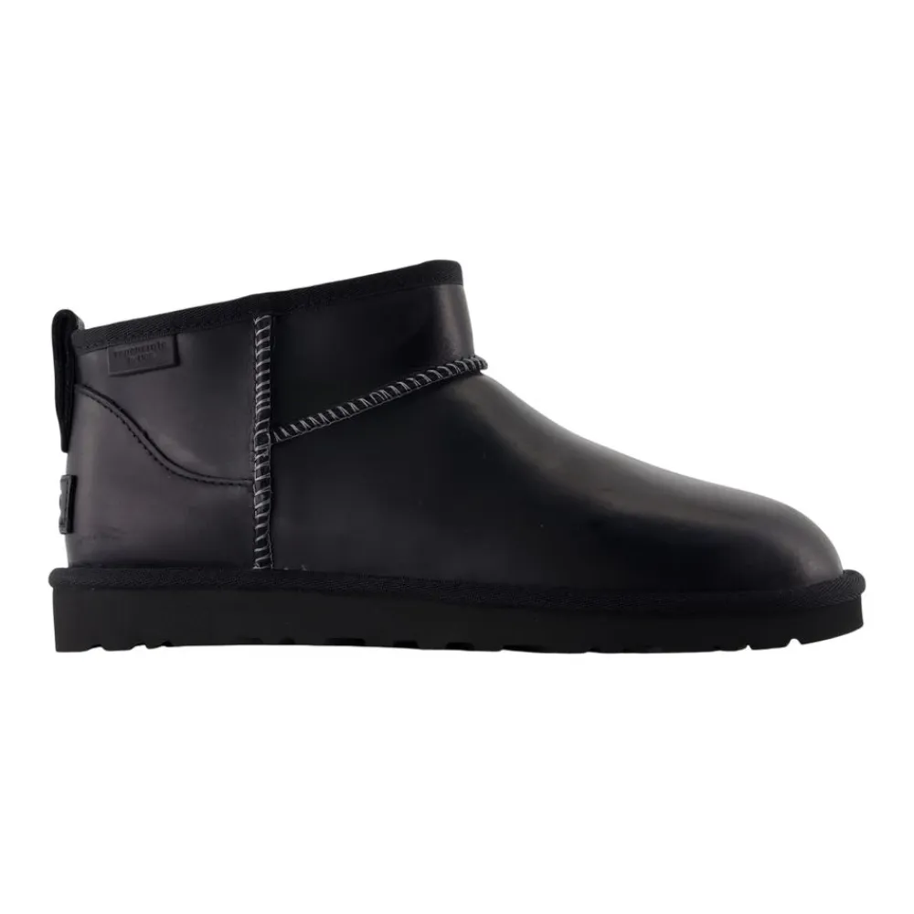 UGG Classic Ultra Mini Læder Regen Ankelstøvler kombinerer en overdel i ægte læder med blødt fåreskindfor for letvægtsvarme og hverdagsbrug om vinteren. Nøgleegenskaber: Sort | Kalveskind | UGGplush fåreskindfor for varme | Letvægts sukkerrørs-EVA mellemsål | Slidstærk rillet gummisål for godt greb | Trækfane bagpå for nem på- og aftagning | Forstærket hælkappe for stabilitet | Slip-on model | Asymmetrisk toplinje | Kort (mini) skaft | Rund tå | Præget læderhælmærke | Mål og pasform: Indersålens længde for størrelse 42: 28 cm | Normal i størrelsen (fransk størrelsessystem) | Sammensætning og pleje: Kalveskind (overdel) | Fåreskindfor (UGGplush) | EVA mellemsål | Gummisål | Tekstilbinding