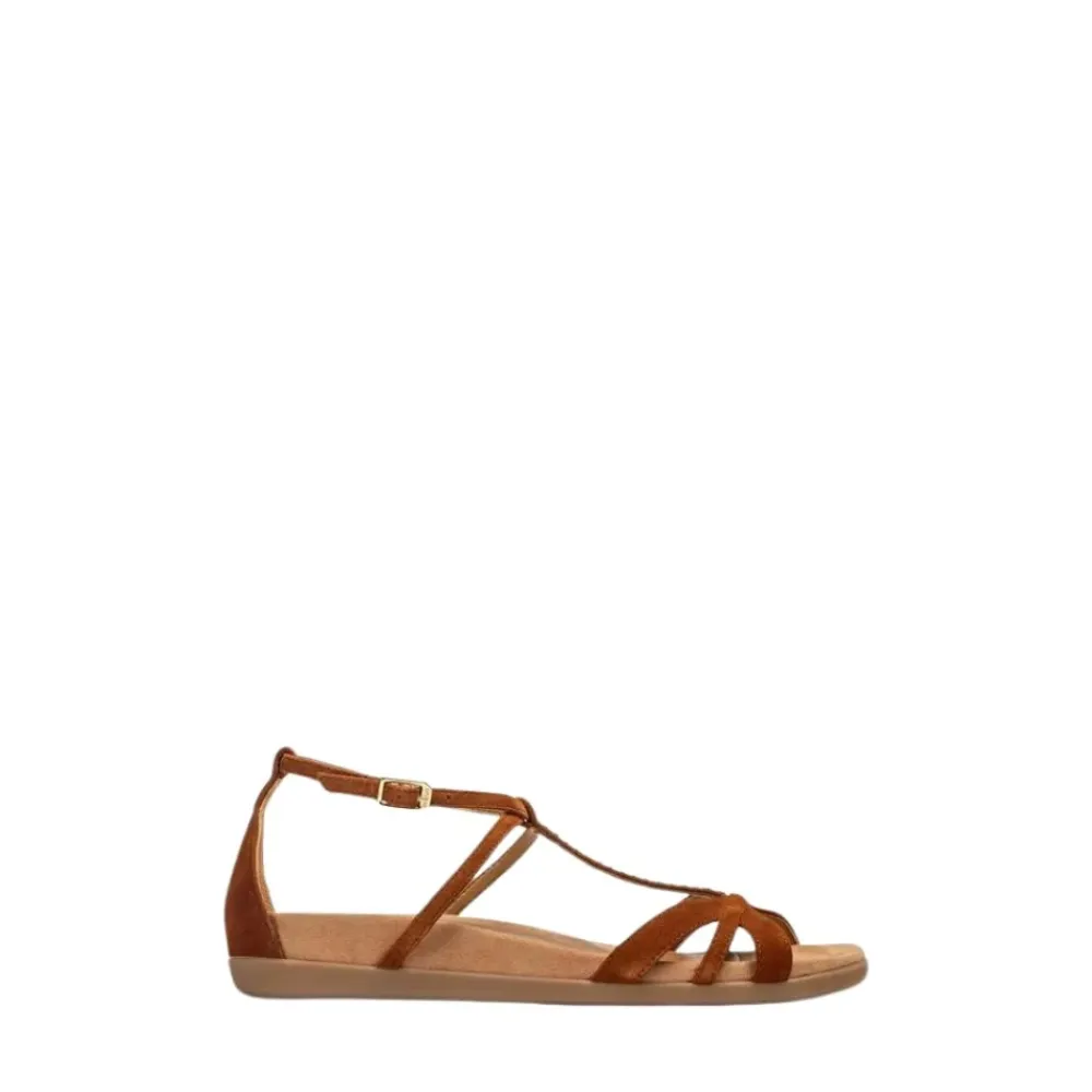 Opgrader din sommerstil med disse Unisa flade sandaler til kvinder. Fremstillet i kamel ruskind med en rund tå, har disse sandaler ruskindstropper og krystaldetaljer på vristen. Justerbar ankelrem med en metal spænde for en sikker pasform. Den lette, fleksible og skridsikre gummisål har en højde på 3,5 cm. Flade sandaler er et must-have tilbehør til denne sæson.