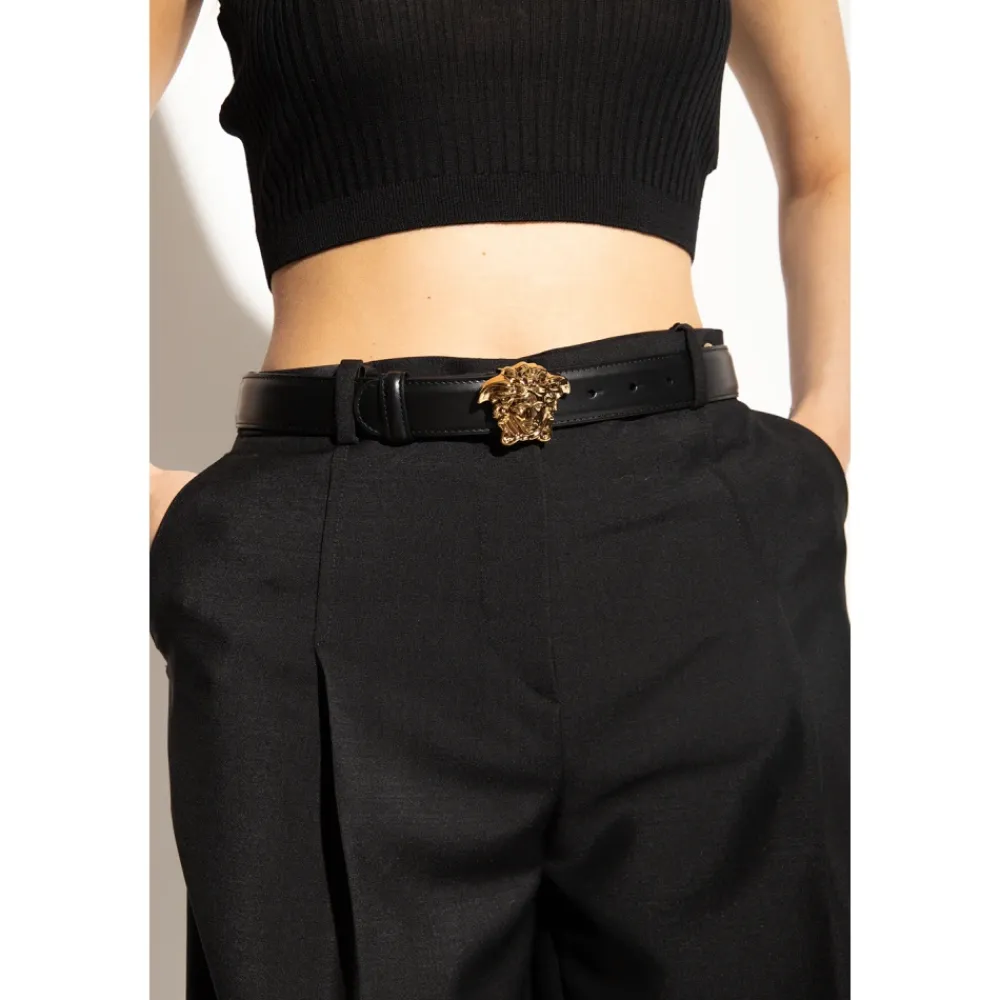 Sort bælte fra Versace. Lavet af kalveskind, dette element har en tredimensionel Medusa-spænde i guldfarve.Translation: Sort bælte fra Versace. Lavet af kalveskind, dette element har en tredimensionel Medusa-spænde i guldfarve.