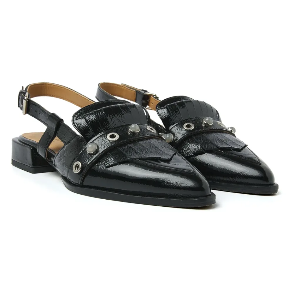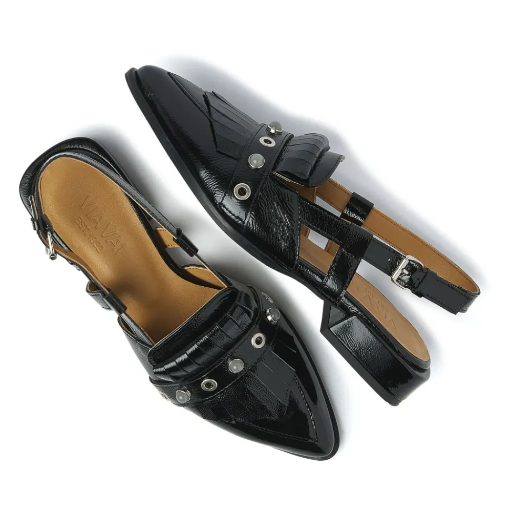 Oplev Jazz Tammi Sandaler fra Via Vai, en perfekt blanding af femininitet og kant. Disse slingbacks har en luksuriøs laklæderfinish, hvilket gør dem til en alsidig tilføjelse til enhver garderobe. Produkt detaljer: Sort | Højkvalitets laklæder | Justerbar hælstrop | Diskret blokhæl | Spids tå | Frynsedetaljer med sølv studs på vristen | Sammensætning og pleje: Læderforing