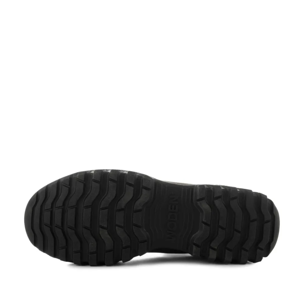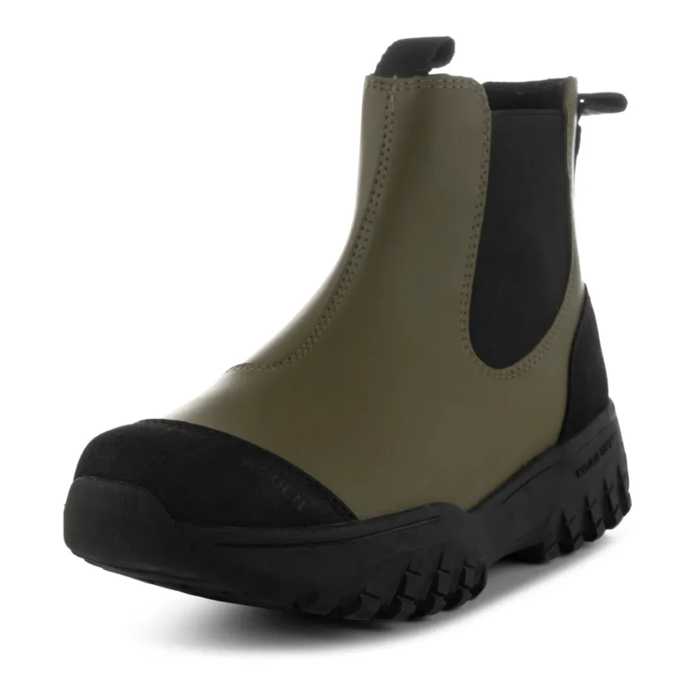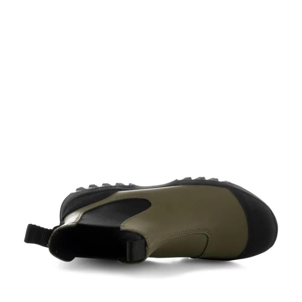 Oplev Magda Track, en slidstærk, vandtæt Chelsea støvle fra Woden, fremstillet med 70% naturgummi og unikke fiskelæderdetaljer. Ideel til rejser, disse støvler sikrer komfort og stil. Produkt detaljer: Mørk Oliven | Grøn | Naturgummi | Vandtæt | Åndbar | Letvægt | Stødabsorberende | Fiskelæderhæl | Signatur ydersål | Dimensioner og pasform: Almindelig pasform | Sammensætning og pleje: 70% Naturgummi | 30% Gummi | Aftørres med en fugtig klud
