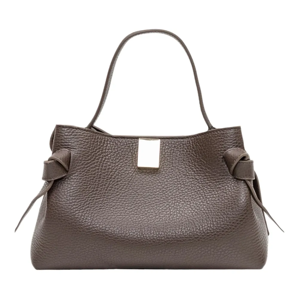 Yuzefi håndtaske fremstillet af kornet læder med raffinerede knudedetaljer på siden. En poleret hverdagstaske, der fremhæver taktil tekstur og karakteristiske knudeaccenter for alsidig brug. Vigtige egenskaber: Brun | Espresso | Læder | Knudedetaljer på siden | Kornet finish | Sammensætning & pleje: Læder